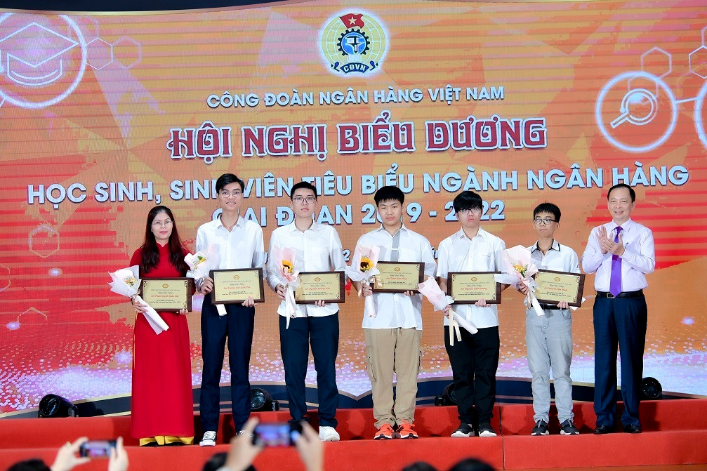 Ông Đào Minh Tú – Phó Thống đốc Thường trực NHNN, Chủ tịch CĐNHVN trao học bổng của Thống đốc cho các em tại Hội nghị biểu dương học sinh, sinh viên tiêu biểu ngành ngân hàng giai đoạn 2019 - 2022.