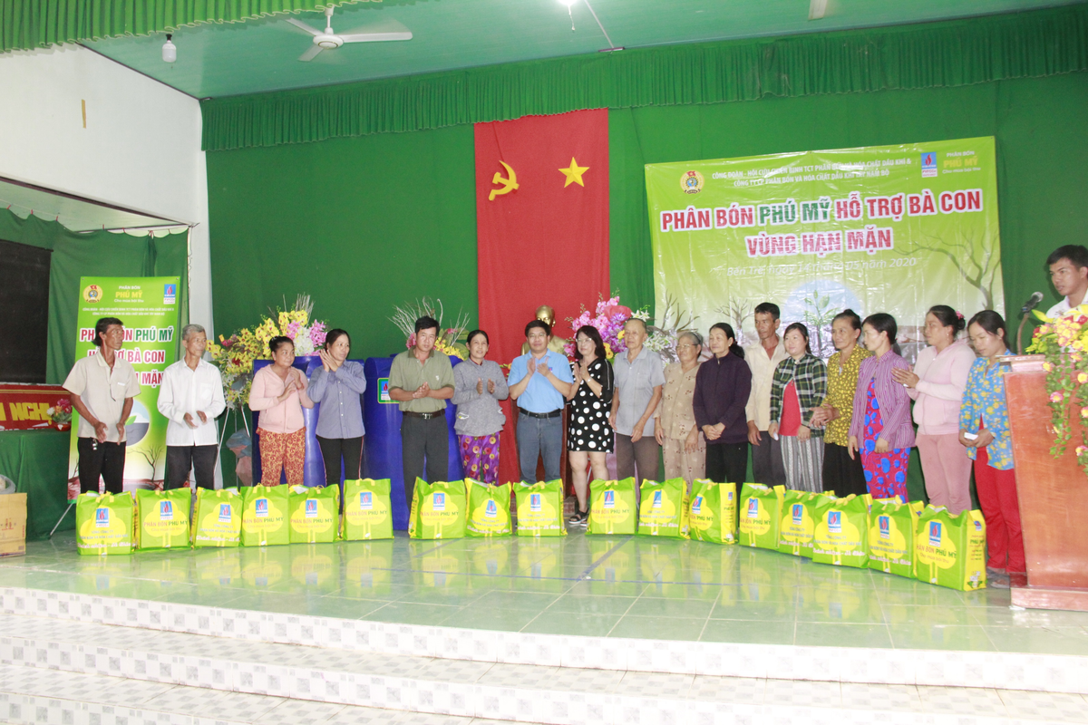 Cụ thể, ngày 14/05, Công đoàn PVFCCo phối hợp cùng Hội cựu chiến binh PVFCCo, Công ty CP Phân bón và Hóa chất Dầu khí Tây Nam bộ (PVFCCo SW) cùng 2 đại lý phân phối phân bón Phú Mỹ tại Bến Tre tổ chức chương trình trao tặng bồn chứa nước và các phần quà cho nhiều hộ gia đình chính sách, gặp khó khăn do ảnh hưởng của hạn mặn tại một số xã thuộc huyện Thạnh Phú, tỉnh Bến Tre.