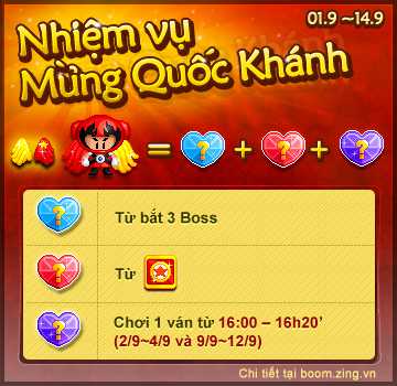 Đặc biệt, thời gian này người chơi sẽ hội ngộ với các Boss siêu cấp trong trong Boom, đó là: Mèo Ú, Alien và Dark Hero. Chiến thắng các nhân vật này người chơi sẽ nhận được vật phẩm Hoa Nắng Mai. Đối với Anh hùng bóng đêm Dark Hero người chơi sẽ nhận thêm trang phục và nón của nhân vật này khi chiến thắng.