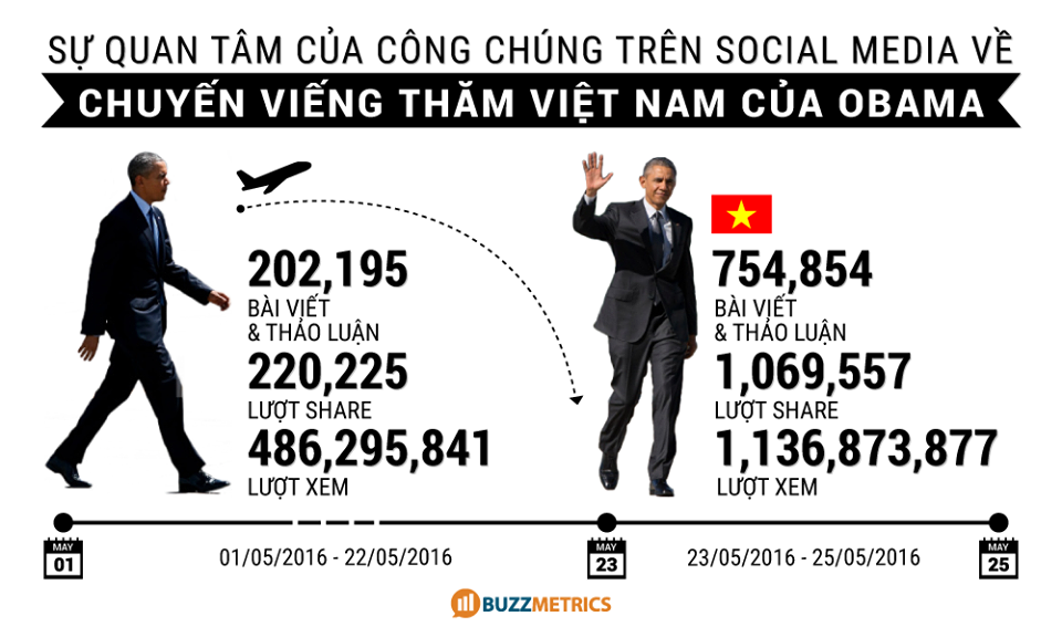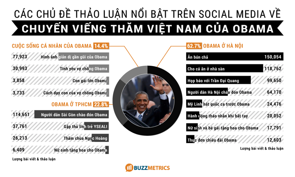 Theo Buzzmetrics Social Listening có trụ sở tại TP.HCM, có gần 755,000 bài viết và thảo luận bằng tiếng Việt trên các mạng xã hội liên quan đến Tổng thống Obama trong thời gian ông đến thăm Việt Nam từ 23 đến 25/5.