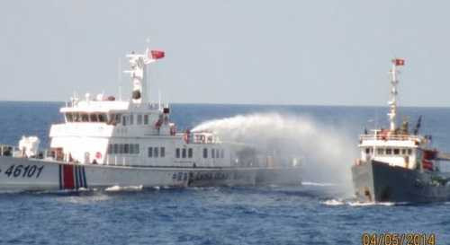 | Tàu Trung Quốc hung hăng xịt nước vào tàu Việt Nam trên vùng biển nước ta - Ảnh: CSB VN. |