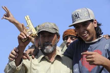 Anh chàng khoảng ngoài đôi mươi này đã may mắn có trong tay khẩu súng vàng của Gaddafi, đồng thời cũng đã hết sức mừng rỡ khoe chiến lợi phẩm đó trước ống kính camera của báo giới với tư cách là một người trung thành với NTC.