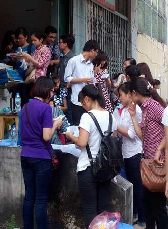 | Thí sinh xếp hàng mua “phao” thi tại cửa hàng photocopy nhà C1T của Trung tâm thông tin thư viện, ĐH Quốc gia Hà Nội. Ảnh: Minh Minh. |