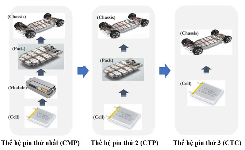 Ở thế hệ đầu tiên (CMP), các tế bào (Cell) pin được đóng gói trong các Module. Tiếp đến, các Module pin được kết nối tạo nên Pack pin. Pack pin sau đó được lắp vào khung gầm xe (Chassis). Phương pháp truyền thống “4 bước” này đòi hỏi nhiều linh kiện và không gian lắp đặt hơn, do đó vừa làm tăng trọng lượng tổng thể xe vừa làm tăng chi phí sản xuất trong khi công suất pin khó đạt con số kỳ vọng.