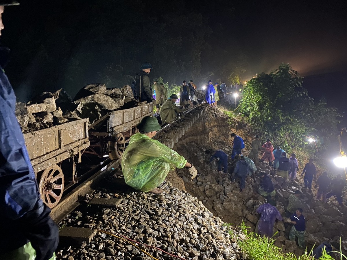 Ngoài ra, mưa lớn cũng khiến nhiều đất đá, cây xanh từ trên núi sạt lở chảy tràn xuống bồi lấp đường sắt. Việc sạt lở khiến hai hướng không thể lưu thông qua khu vực. Các đoàn tàu bị ách tắc, phải đậu ở các ga Hòa Duyệt (xã Đức Liên), ga Yên Duệ (xã Đức Hương, huyện Vũ Quang)…
