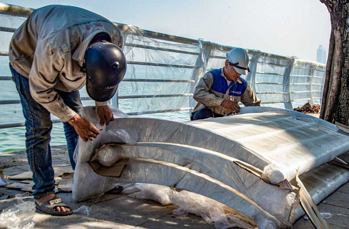 Một công nhân đang thi công thay thế lan can ở Hồ Tây cho hay: "Toàn bộ hệ thống lan can cũ sẽ được thay mới, chúng tôi đã tiến hành làm được hơn 1 tháng và hoàn thiện tại một số đoạn. Dự kiến đến hết tháng 12, mọi công tác thay thế sẽ được hoàn thành và bàn giao cho quận Tây Hồ”.