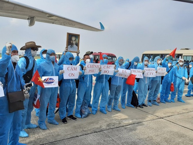Không giấu được niềm vui mừng khi máy bay hạ cánh, anh Đoàn Diện cho biết: “Cuối cùng chúng tôi đã đặt chân lên quê hương sau nhiều ngày lo lắng. Chúng tôi giơ những tấm biển tỏ lòng biết ơn với Đảng, Chính phủ, đội ngũ y tế và hãng hàng không khi ra khỏi tàu bay.
