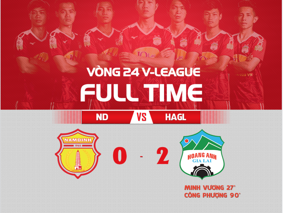 HAGL không quá khó khăn để đánh bại Nam Định khi đối thủ đang ở vào tình thế ngặt nghèo và tỏ ra đuối lực trong cuộc chiến trụ hạng. Minh Vương là người mở tỷ số cho HAGL với pha đánh đầu chuẩn xác, trước khi Công Phượng mang về 3 điểm trọn vẹn cùng tấm vé ở lại V-League cho thầy trò HLV Dương Minh Ninh. Bàn thắng này cũng giúp Công Phượng vững vàng ở vị trí chân sút nội tốt nhất V-League 2018.