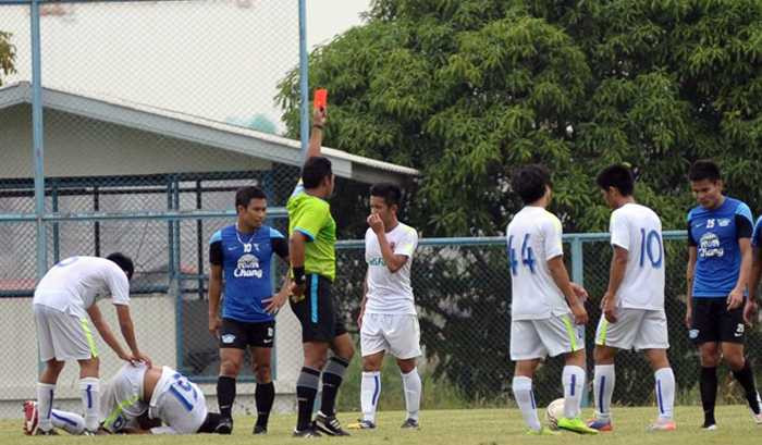 | Cầu thủ Chonburi FC nhận thẻ đỏ vì phạm lỗi thô bạo (Ảnh: Zing.vn) |