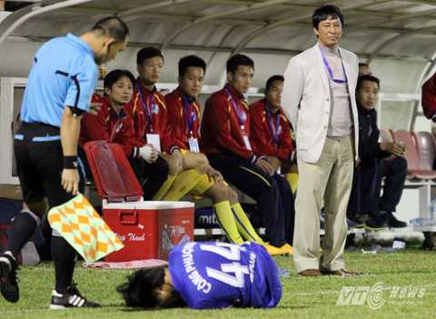 | HLV Vũ Quang Bảo nhìn Công Phượng bị đau (Ảnh: Minh Trần) |