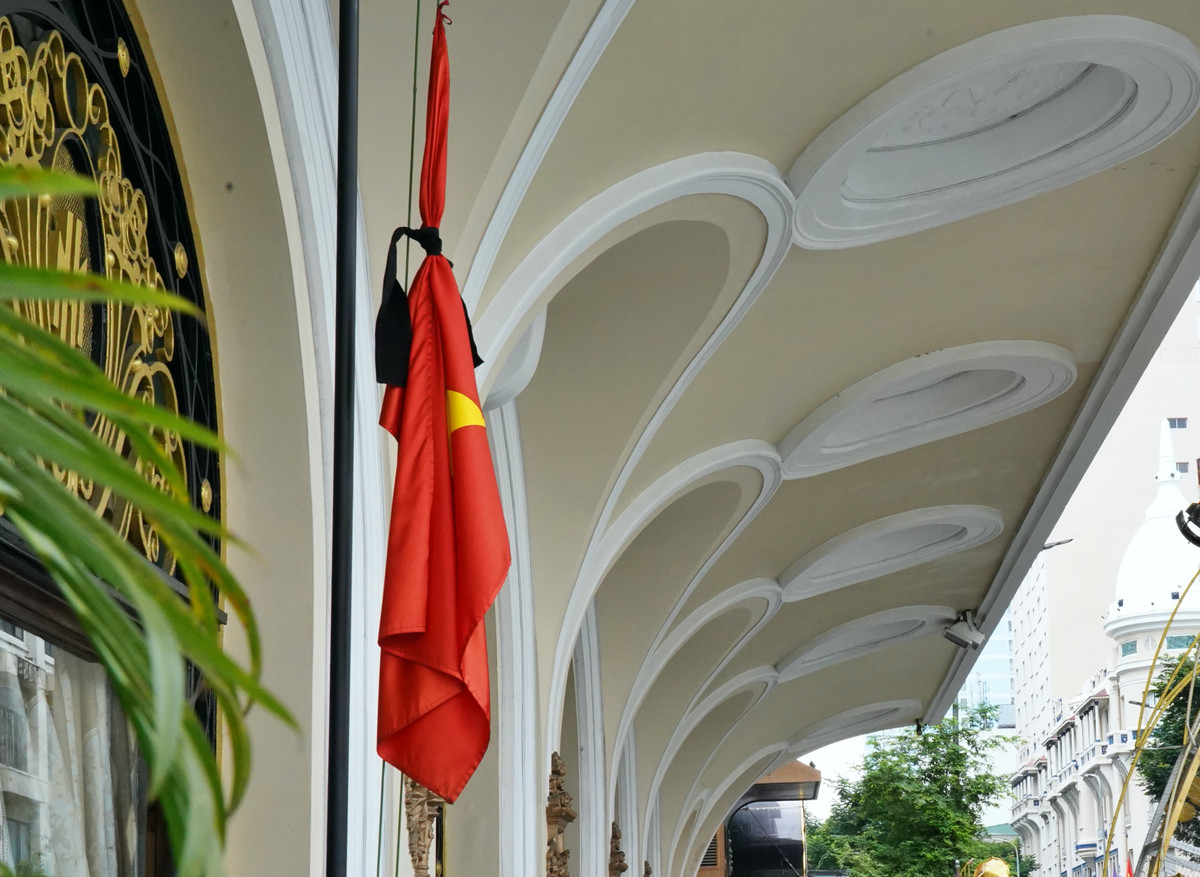 Lá cờ Tổ quốc được gắn dải băng đen tại một khách sạn nằm trên phố Đồng Khởi (Quận 1).