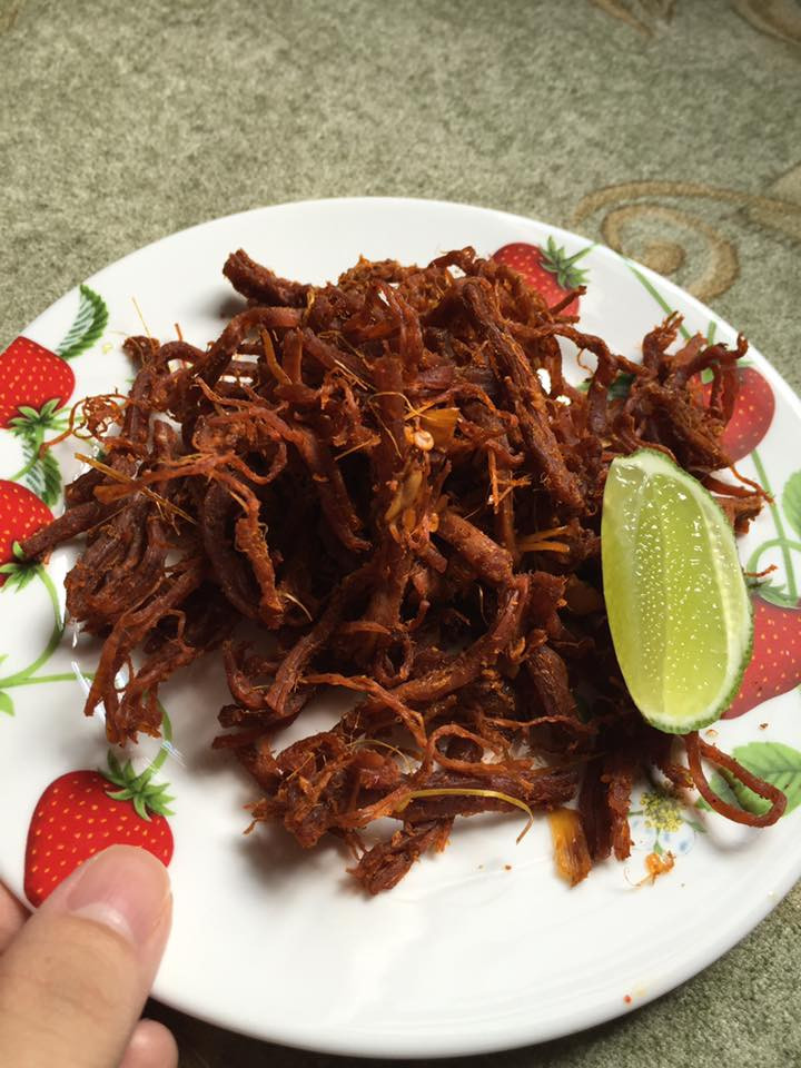 Thành phẩm thu được là thịt lợn giả bò khô vàng ruộm, thơm lừng, cay cay, mặn mặn nhâm nhi với bia thì tuyệt vô cùng.