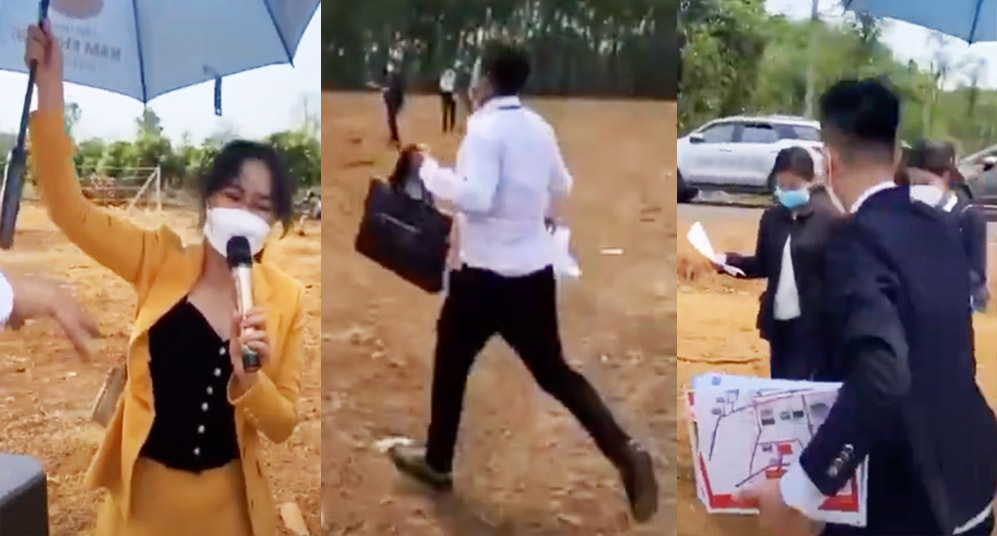 Cụ thể, khung cảnh trong đoạn clip 4 phút là một bãi đất trống với hàng chục chiếc xe ô tô đậu bên đường. Xuất hiện trong clip là những thanh niên mặc vest, sơ mi, tay cầm cặp da và giấy chứng nhận quyền sử dụng đất chạy đi chạy lại thông báo chốt cọc với một MC.