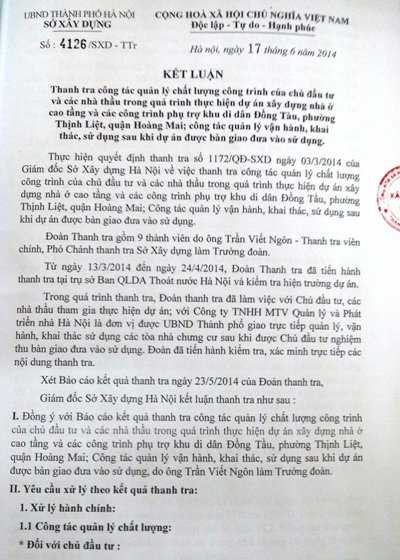 Căn cứ vào báo cáo này, ngày 17/6, Giám đốc Sở Xây dựng Hà Nội đã ký văn bản kết luận thanh tra, đồng ý với Báo cáo kết quả thanh tra công tác quản lý chất lượng công trình của chủ đầu tư và các nhà thầu trong quá trình thực hiện dự án xây dựng nhà ở cao tầng và các công trình phụ trợ khu di dân Đồng Tầu.