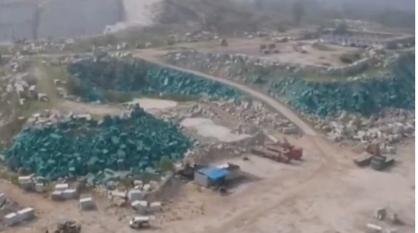 Nhìn từ trên không, những đống gạch vụn xung quanh Nhà máy vật liệu đá Changsheng (CCRMF) ở Tân Thái, tỉnh Sơn Đông, Trung Quốc trông như những đồi cỏ xanh mơn mở.