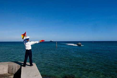 | Chiến sĩ trên đảo Trường Sa hướng dẫn khách vào thăm đảo |