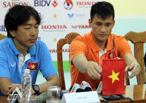 | Công Vinh chỉnh quốc kỳ một cách nghiêm trang (Ảnh: Hà Thành) |