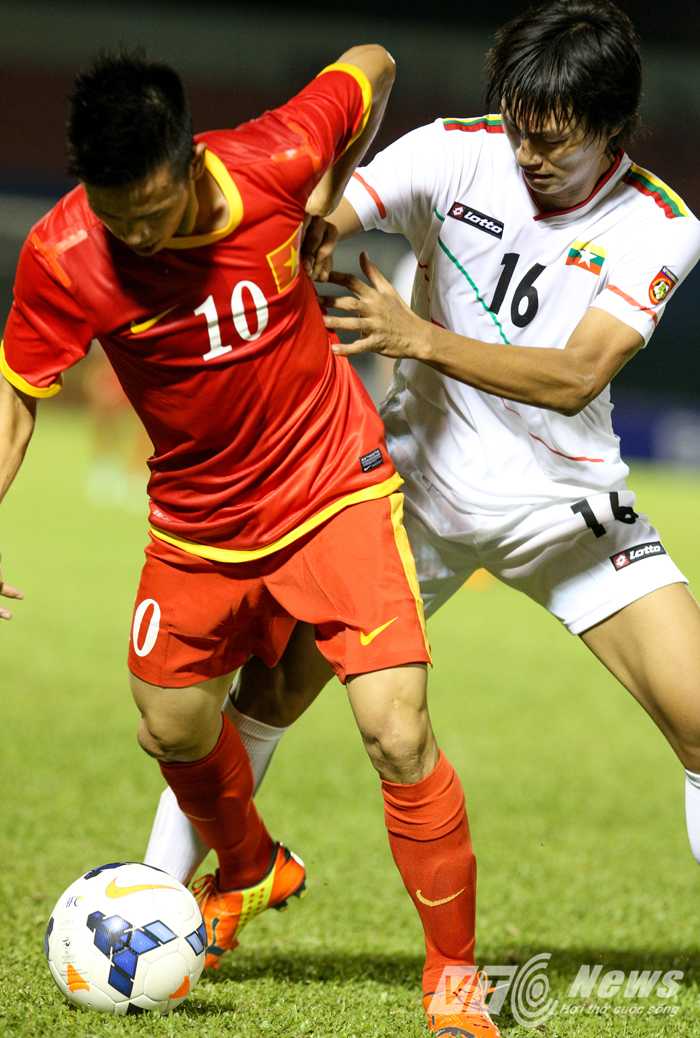 9': KHÔNG VÀO... Thêm một cơ hội nữa cho Vũ Minh Tuấn, lần này khoảng trống trước mặt anh là rất lớn và cũng không bị ai theo kèm. Thế nhưng Minh Tuấn lại không thể đánh bại thủ thành của Myanmar.