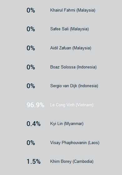 Đây rõ ràng là kết quả sai và chắc chắn có lỗi ở khâu kĩ thuật. Còn nhớ, trong thời gian diễn ra cuộc bầu chọn, chỉ có duy nhất một lần Công Vinh bị soán ngôi số 1. Đó là khi chân sút người Lào Visay Phapouvanin bỗng nhiên vươn lên dần đầu với hơn 92% phiếu bầu.