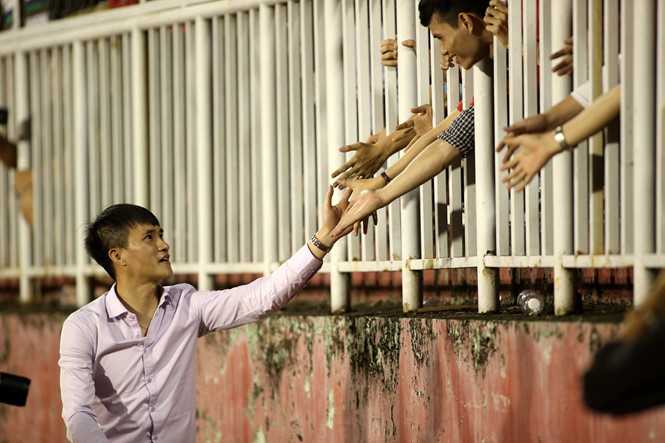 Công Vinh bắt tay với một cổ động viên trên sân Thống Nhất.