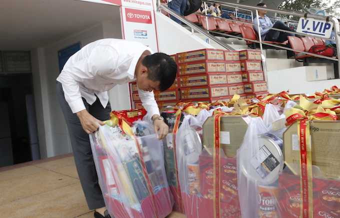Công Vinh kiểm tra những phần quà dành trao tặng các cựu danh thủ lão làng