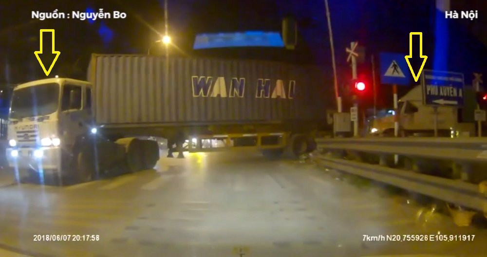 Chiếc container đầu vượt qua được đường ray. Tiếp ngay sau đó, container thứ 2 cũng cố tình vượt qua, húc thanh rào chắn ngược ra ngoài làn đường quốc lộ.