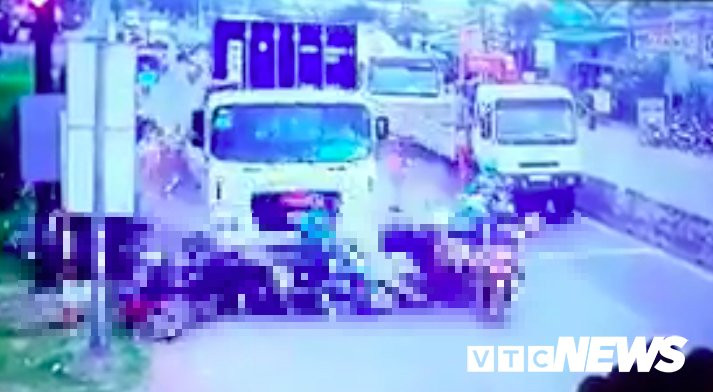Clip: Hiện trường container tông nát hàng chục xe máy dừng đèn đỏ ở Long An
