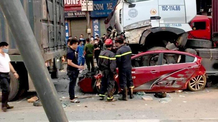 Như VTC News đưa tin, khoảng 3h15 cùng ngày, tài xế Lê Thế Tuyển (SN 1988, trú tại xã Tiền Phong, huyện Vĩnh Bảo, Hải Phòng) lái ô tô mang BKS 15C-114.66 kéo theo rơ mooc 15R-046.41 đi trên đường Nguyễn Văn Linh hướng từ Trâu Quỳ tới Cầu Chui, khi đến khu vực cột đèn 4/14 thì đâm vào đuôi xe ô tô con 30E-925.52.