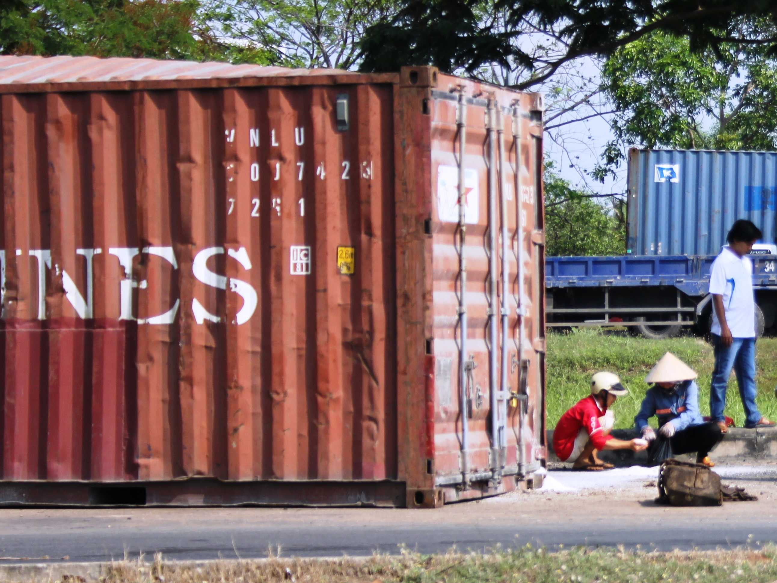 Hiện trường container đánh rơi hai thùng hàng chở đầy gạo