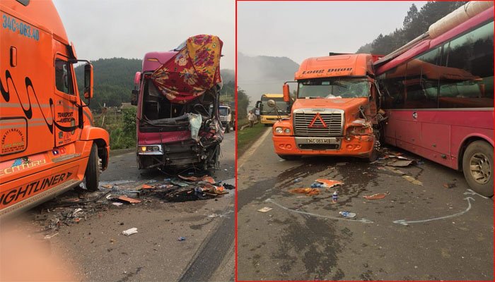 Cú va chạm mạnh khiến xe khách bị vỡ nát cabin, hư hỏng nặng, xe container bị hư hỏng phần đầu xe, giao thông ùn tắc nghiêm trọng.