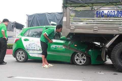 Ngay lúc đó, một chiếc xe taxi BKS 51F-51282 của hãng Mai Linh chạy từ phía sau không phanh kịp đã tông phải đuôi chiếc xe tải. May mắn không có ai bị thương.