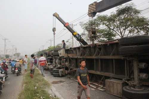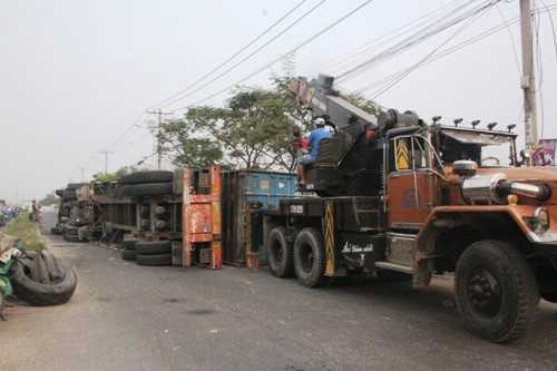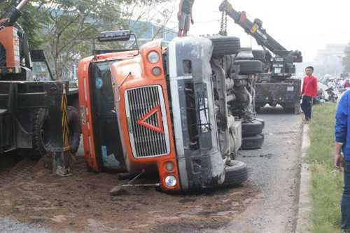 | Chiếc xe lật khi ôm cua trên đường M1 (tuyến đường nội bộ KCN Tân Bình, TPHCM) |