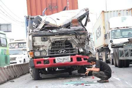 Khi vừa tới đoạn dưới chân cầu ngã tư Thủ Đức thì xảy ra va chạm với xe container BKS: 50LD - 055.69 di chuyển cùng chiều.