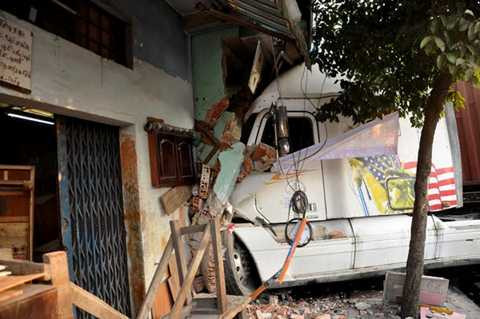 | Hiện trường vụ container đâm sập nhà dân. |
