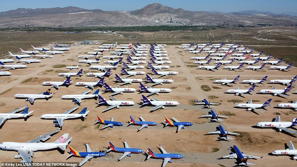 Sân bay Victorville ở Nam California được dùng làm bãi đỗ tạm thời cho 200 chiếc máy bay thương mại. Tất cả chúng đều không cất cánh trong nhiều ngày qua do ảnh hưởng của dịch Covid-19.