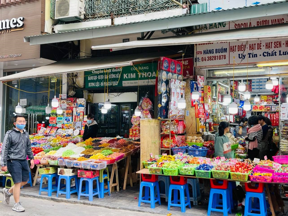 Một trong những khu phố buôn bán bánh kẹo, nước giải khát nổi tiếng nhất ở Hà Nội là phố Hàng Buồm (Quận Hoàn Kiếm) cũng lâm vào tình hình ế ẩm không kém. Tại đây, từng dãy hàng bày bán vô số đồ Tết ra ngoài vỉa hè, khiến đường phố bắt mắt với nhiều màu sắc. Tuy nhiên, khách hàng vẫn thờ ơ lướt qua. Nhiều quầy hàng vắng tanh không bóng người mua, tiểu thương chỉ biết ngồi buôn điện thoại, tán dóc.
