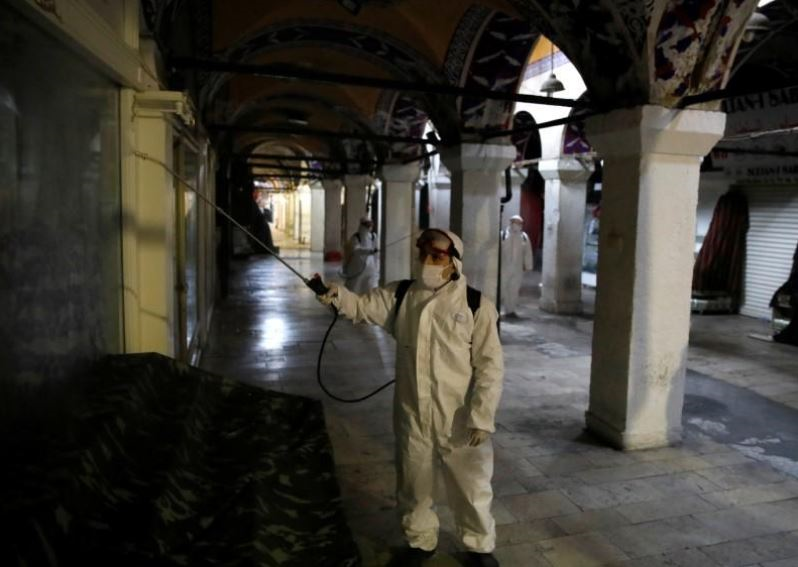 Khử trùng tại khu chợ Covered Bazaar, Thổ Nhĩ Kỳ. (Ảnh: Reuters)