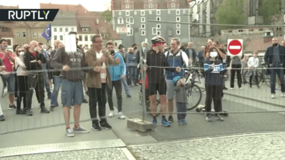 Hàng trăm người tập trung ở cả 2 bên biên giới giữa thị trấn Zgorzelec của Ba Lan và thị trấn Goerlitz của Đức vào hôm 24/4.