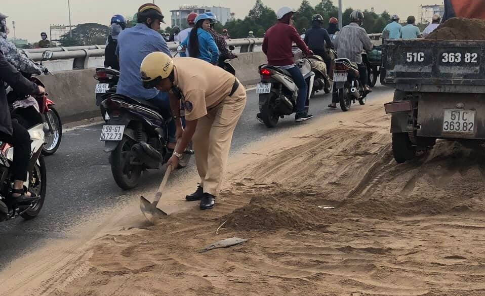 Khi đến cầu vượt Quang Trung, quận 12, tổ công tác phát hiện xe tải chở cát đang gặp sự cố phải đỗ xe sát mép phải cầu, làm rơi vãi lượng lớn cát xuống đường, gây ùn ứ giao thông.