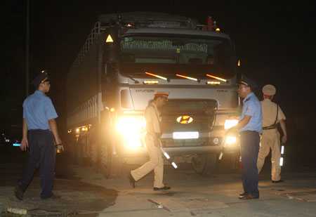 | Lực lượng chức năng kiểm tra trọng tải đêm 15/9 tại Hòa Bình. Ảnh: Báo Giao thông |