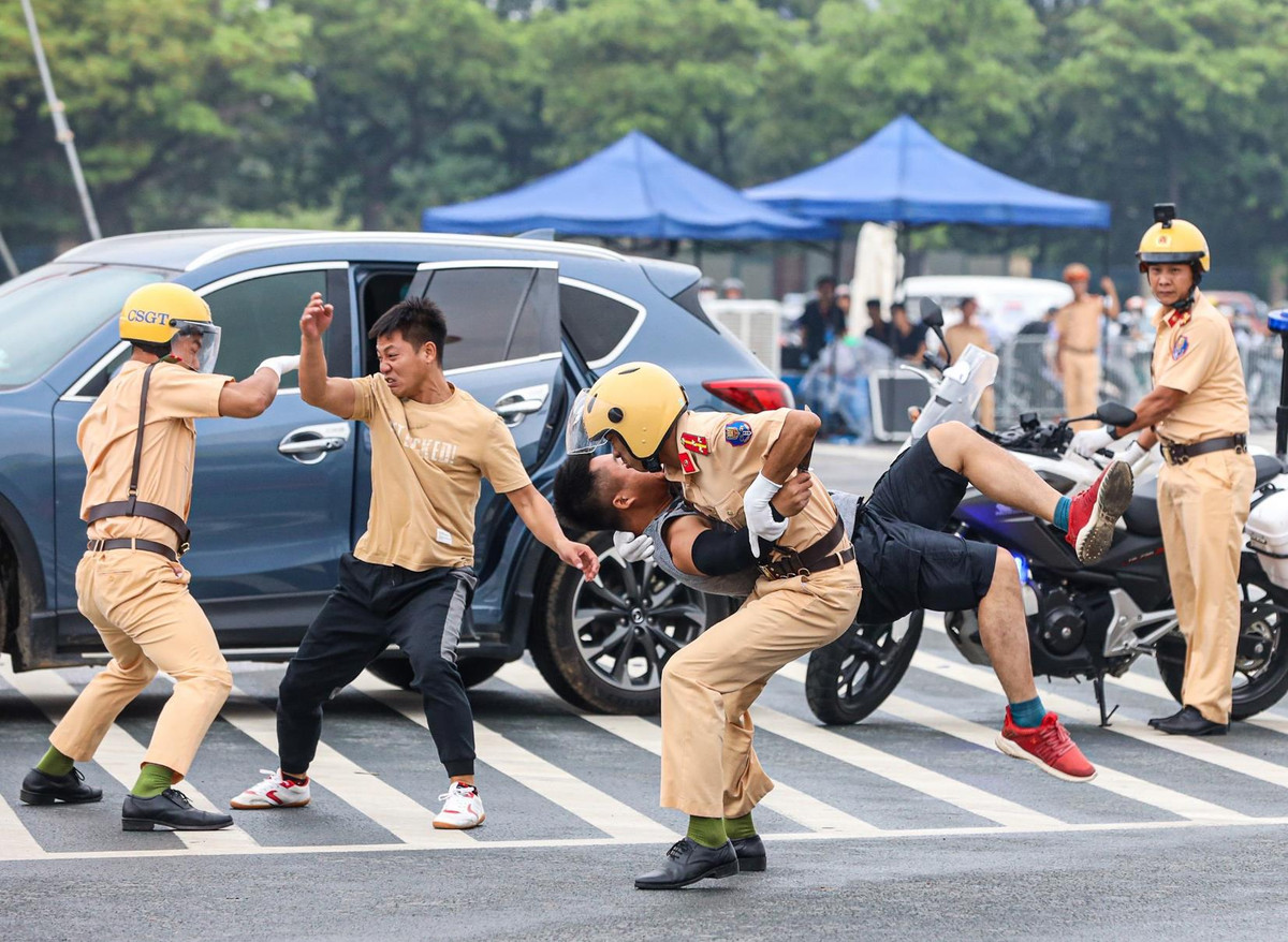 Tình huống thanh niên gây rối tại chốt kiểm soát cũng được biểu diễn tại hội thi. Nữ chiến sĩ CSGT sử dụng nhiều đòn đánh khống chế các đối tượng xăm trổ.