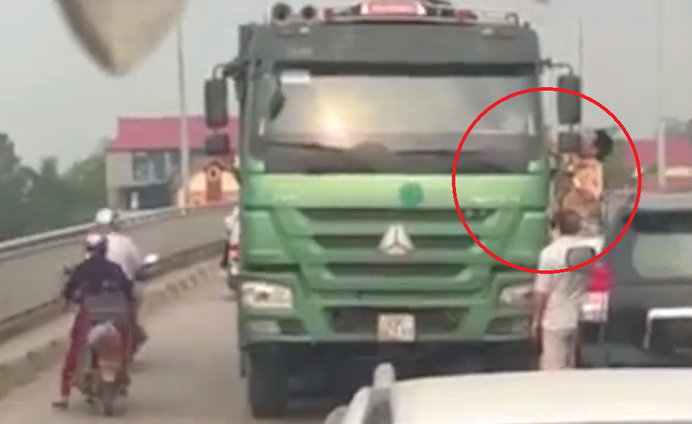 Lúc này, một chiến sĩ CSGT áp sát chiếc xe, trèo lên phía cửa lái yêu cầu tài xế dừng xe để phối hợp kiểm tra nhưng bất thành.