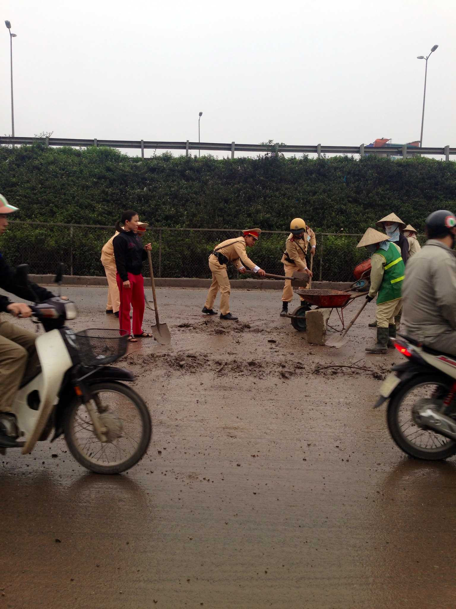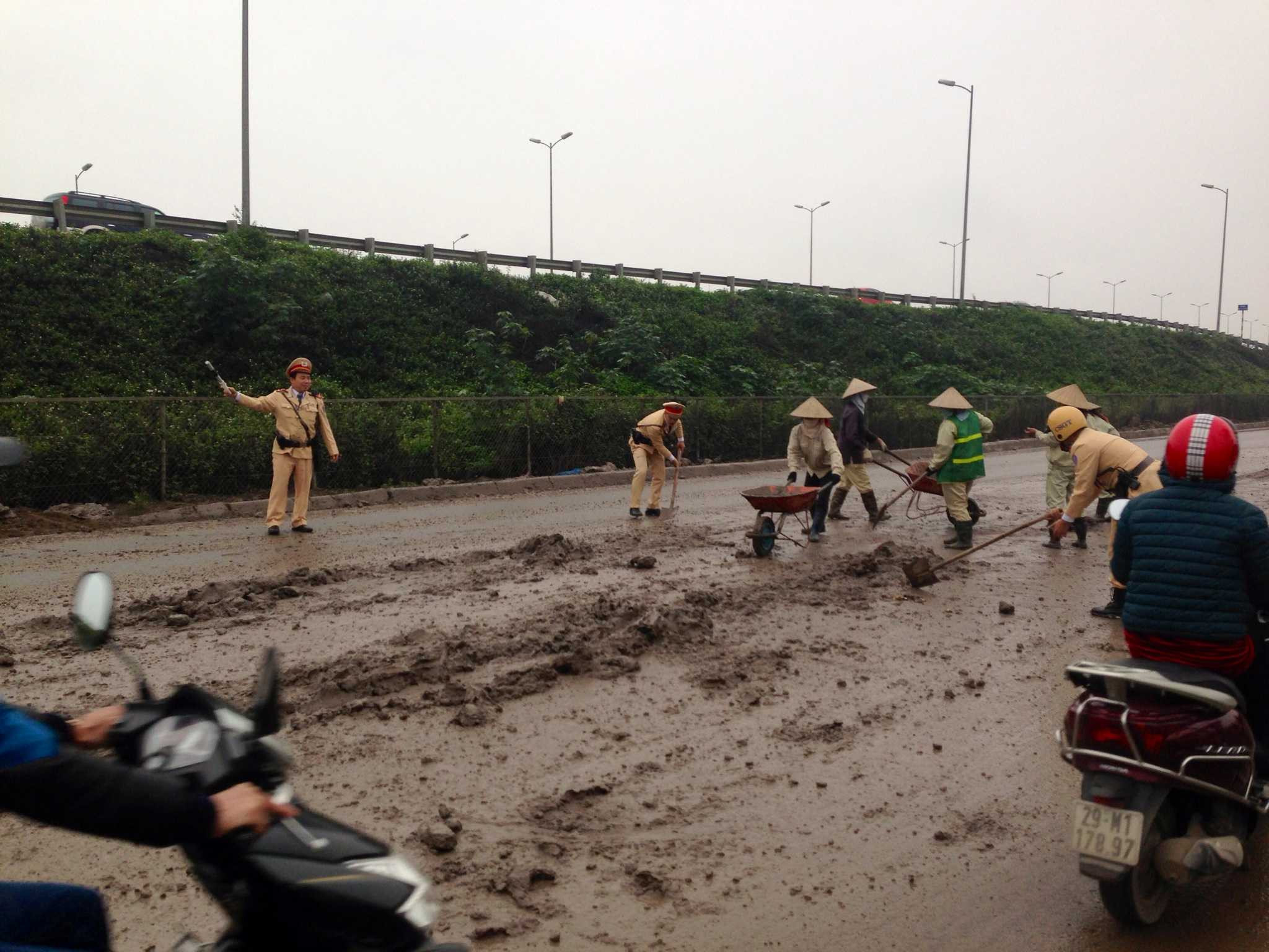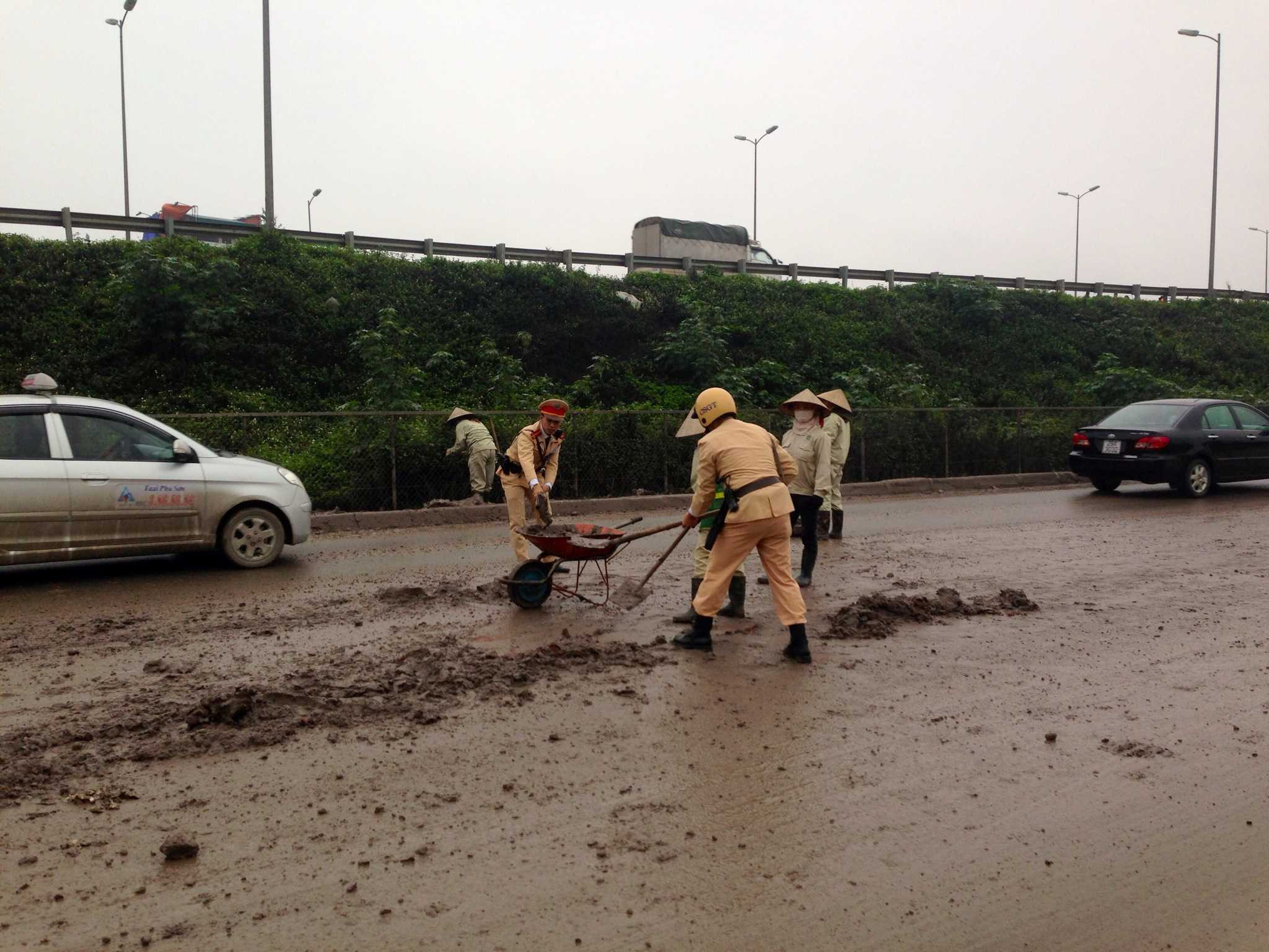 Bùn đất rơi vãi trên đường nhanh chóng được dọn sạch