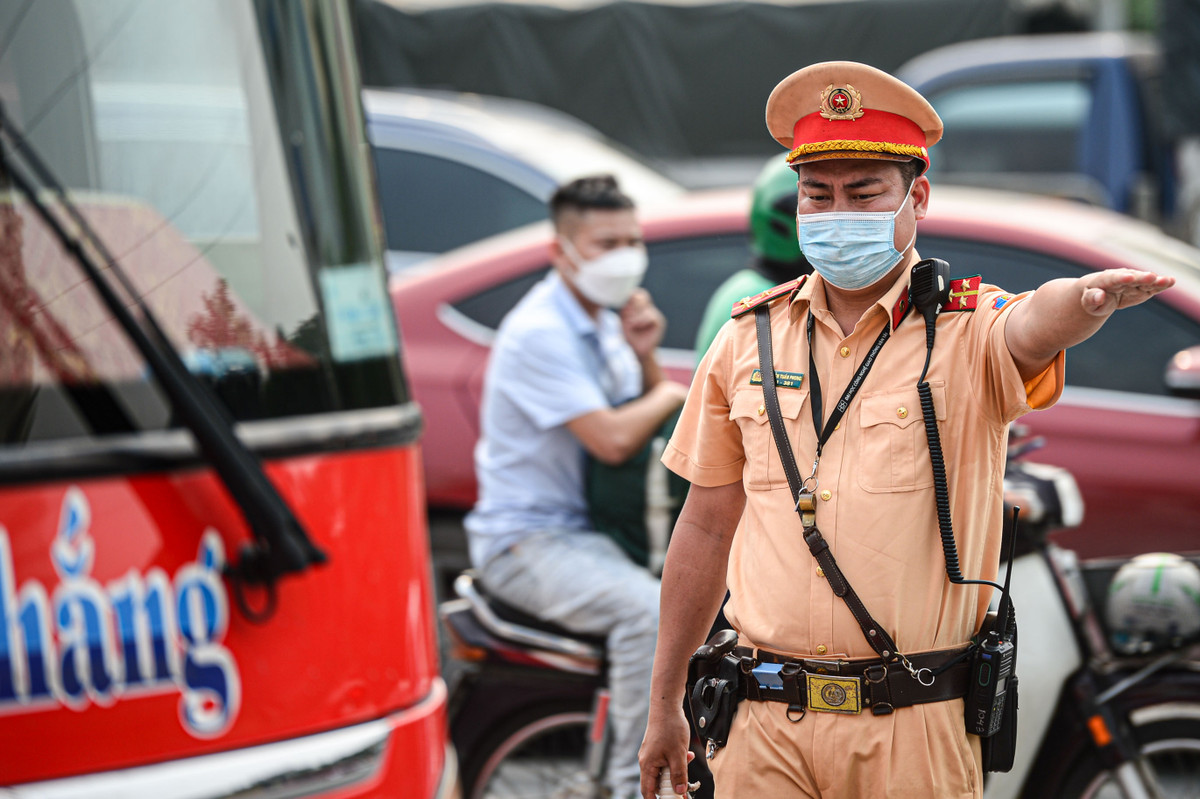 Đội Cảnh sát Giao thông (CSGT) đường bộ số 6 (Phòng CSGT, Công an TP Hà Nội) lập chốt xử lý vi phạm trật tự an toàn giao thông trên đường Phạm Hùng (khu vực trước cổng bến xe Mỹ Đình).
