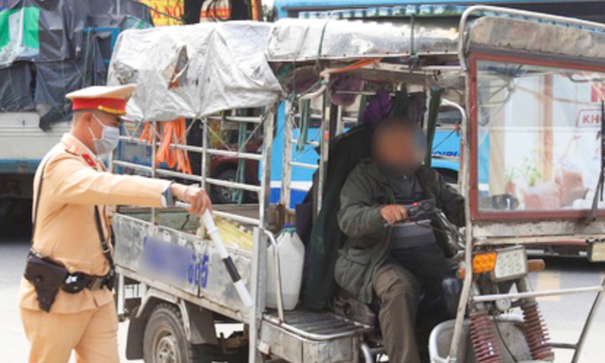 Lực lượng chức năng xử lý một tài xế xe ba bánh không bảo đảm các điều kiện an toàn để tham gia giao thông. (Ảnh: Ngọc Tiến)