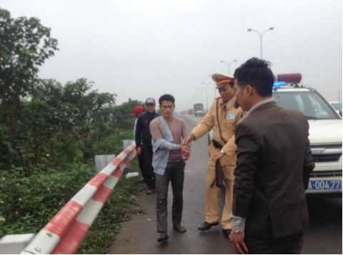 Sau đó, có 3 thanh niên xuống xe, trong đó một người hốt hoảng hô cướp. Thấy có dấu hiệu bất thường, cán bộ trong tổ CSGT đi tới kiểm tra thì 2 thanh niên còn lại lập tức nhảy qua rào chắn quốc lộ và chạy xuống ruộng ven đường.