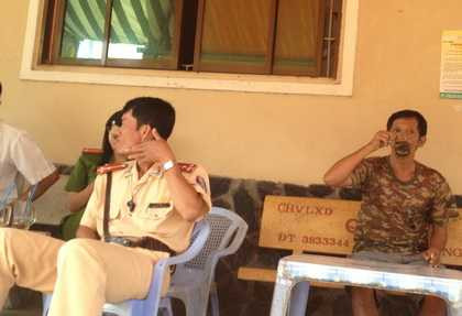 Theo ghi nhận, người đàn ông mặc trang phục cảnh sát giao thông ngồi vắt chân chữ ngũ trong quán cà phê, bên cạnh là một phụ nữ mặc trang phục cảnh sát mang cấp hàm Trung úy. Xung quanh hai cảnh sát có nhiều người ngồi uống cà phê nói chuyện rôm rả.