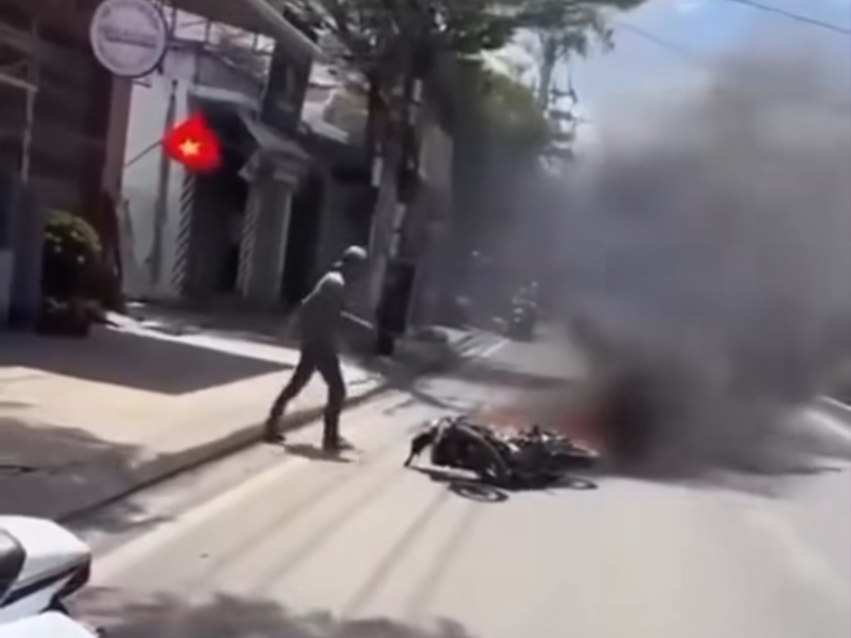 Tuy nhiên, người này không chấp hành, có lời lẽ xúc phạm lực lượng chức năng. Đáng chú ý, thanh niên dùng chân đạp ngã xe máy rồi châm lửa đốt bình xăng. Chỉ trong vài giây, ngọn lửa bùng phát, bao trùm toàn bộ phương tiện. Sau đó, người này rời khỏi hiện trường.