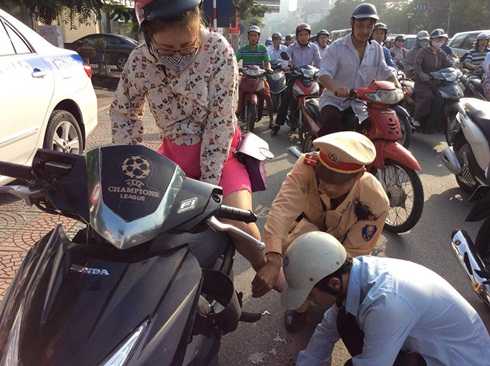 Ngay sau đó, chiến sĩ thuộc đội CSGT số 5 (PC67 - Công an TP Hà Nội) đã khẩn trương đi mua bông băng để sơ cứu vết thương bỏng bô cho thai phụ này.