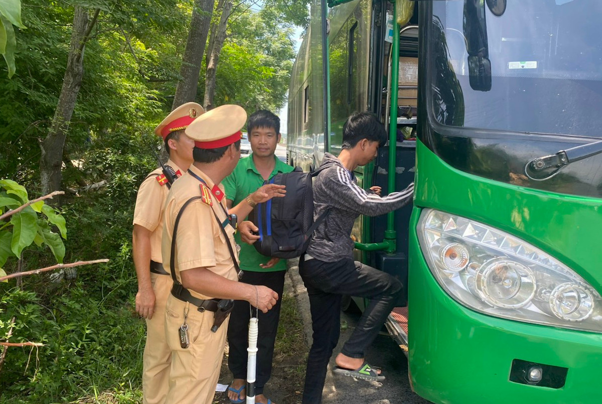 Sau đó tổ công tác Trạm CSGT Phú Lộc cũng hỗ trợ kinh phí và bắt xe khách để em Quyết về quê. (Ảnh: CA)